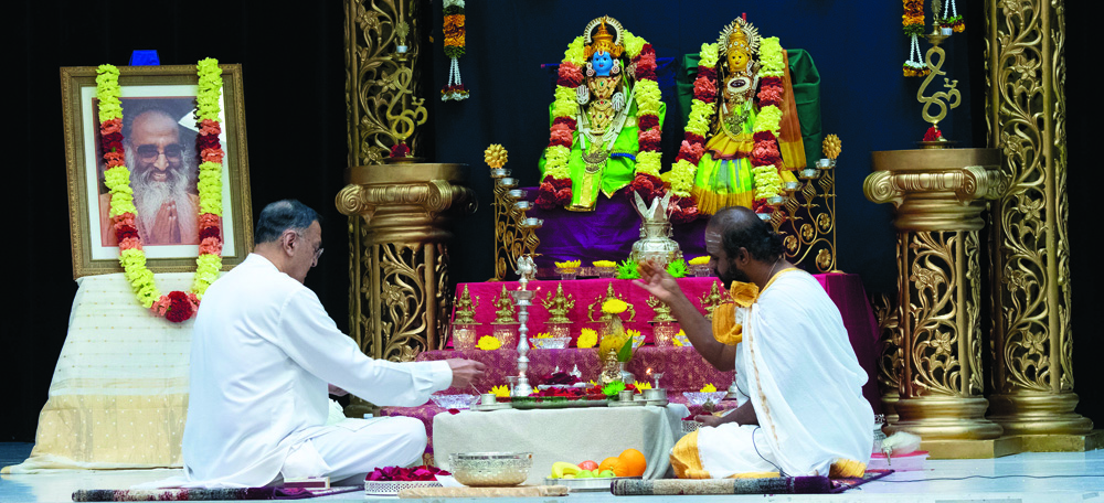 Everyone was attired in the best and brightest clothes. The families seated in rows performed Lakshmi Puja. Sri Ganeshji, head priest of Sri Saumyakasi Sivalaya, officiated the pujas. Lakshmi Ashttothara Shatanamavali (108 names of Sri Lakshmi) followed by Vishnu Sahasaranama (1008 names of Sri Vishnu) were chanted by all seeking the health, wealth, and welfare of everyone.