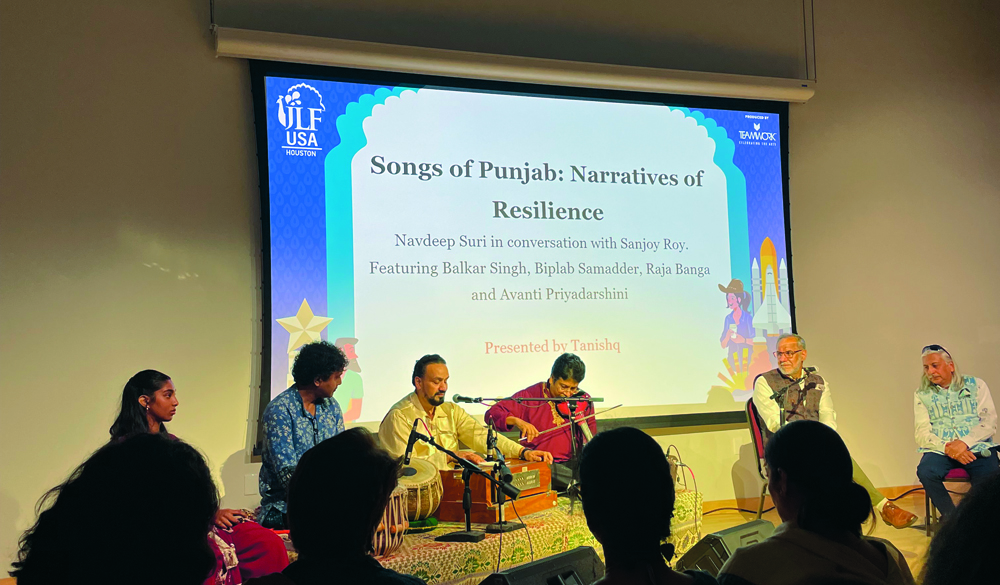The session was at the Eternal Gandhi Museum, Houston where Navdeep Suri was in a conversation with Sanjoy Roy. The discussion was very stimulating and nostalgic as the writer being a grandson was privy to a lot of family lore. The conversation was paused for singing of songs from the book by Balkar Singh, accompanied by Biplab Samadder, Raja Banga and Avanti Priyadarshani on instruments. Balkar Singh had just two days to prepare but his rendering of the pain and agony of the brutality in classical ragas was astounding. The program was called Songs of Punjab: Narrative of Resilience was truly a bleeding testimony of the torture that commoners were subjected to, on the holiest day of Vaisakhi, where Nanak Singh lamented on their fate in these words: