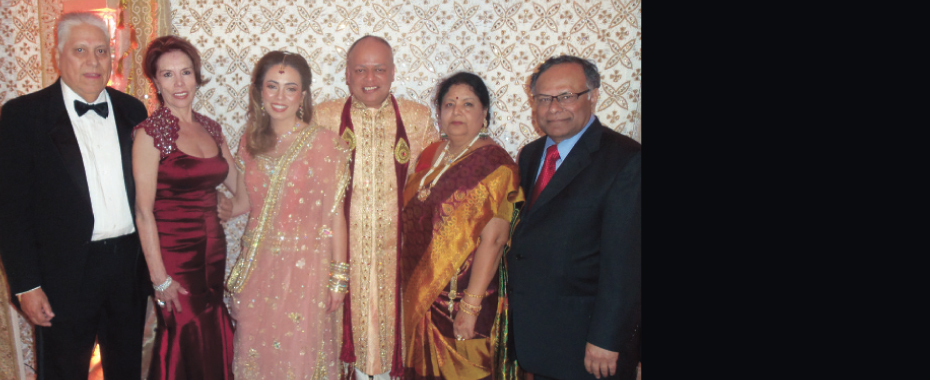The wedding reception for nearly 700 people was more relaxed as the families were introduced and made short speeches. Lillian’s father Carlos called her his “Yellow Rose of Texas”, presenting her with one in a box and Abhishek as “Leo, the Lion” reflecting his Zodiac sign and presenting him with a framed glass painting of a lion. The groom’s father Raghunath recalled his own arranged marriage, much to the delight of the audience and Rita Prasad counseled with words of advice and devoted motherly love for the newlyweds. The food was catered by Gourmet India restaurant. The sangeet was held at the Prasad residence in Richmond two days earlier.