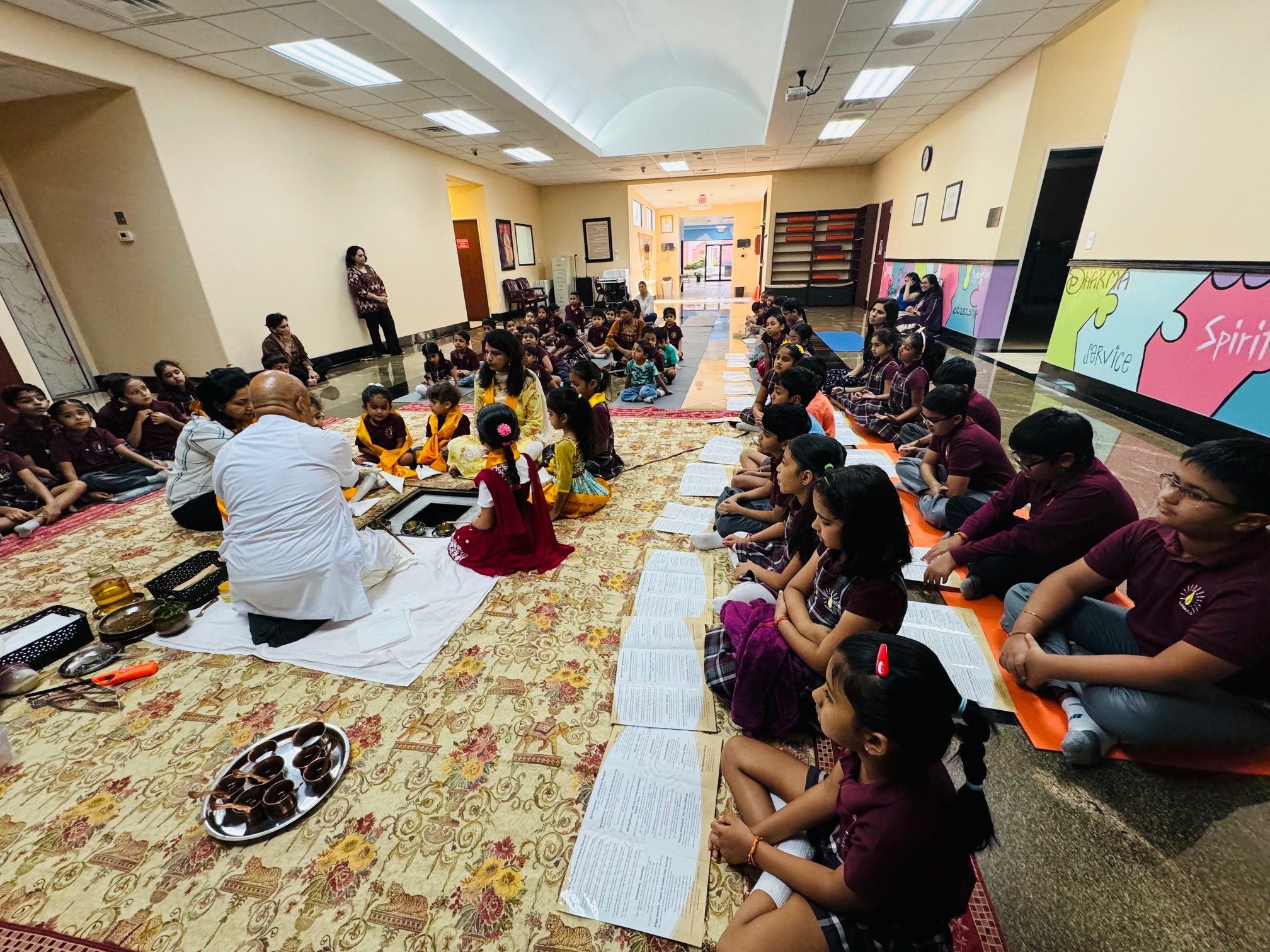 Thursday August 22: Students and teachers participated in havan led by Acharya Bramdeo, seeking divine blessings for a great year of learning. It was highly charged spiritual moments with students reciting the Veda mantras. Besides the regular curriculum, students benefit from Yoga classes, and stay connected to the rich Indian cultural heritage by learning mantras, shlokas with their meanings, the living values of Sanatan Dharma and participate in celebrating American and Indian festivals.