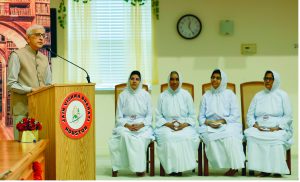 Dr. Jasvant Modi, Philanthropist and President of Vardhaman Charitable Foundation addresses the celebratory gathering in the presence of JVB Samanijis.