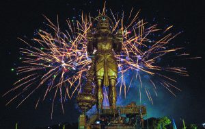 Fireworks behind the monumental Hanuman statue in Sugar Land.