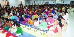 Guided by their Bala Vihar teachers, the children then performed the Chinmaya Namavali puja with sincere devotion. In the adjoining Smriti Hall, adults watched the children perform the puja with quiet reverence as it was broadcast on the big screen. At the heart of the celebration was the theme Chinmaya Amrit Mahotsav with the highlight—a recitation of the Ashtotthara Shatanamavali, invoking Pujya Gurudev’s 108 divine names—evoked a deep sense of connection, drawing the audience into the chanting. This was followed by Chinmaya Mission pledge and the Vedic Aarti concluding the puja.
