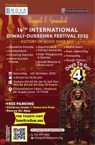 HOUSTON: The Shri Sita Ram Foundation, USA invites the Houston community to celebrate the 14th International Diwali-Dussehra Festival on Saturday, October 4, 2025, at Constellation Field in Sugar Land, Texas. This year’s celebration promises a vibrant blend of cultural entertainment, food, parades, performances, and spectacular fireworks.
