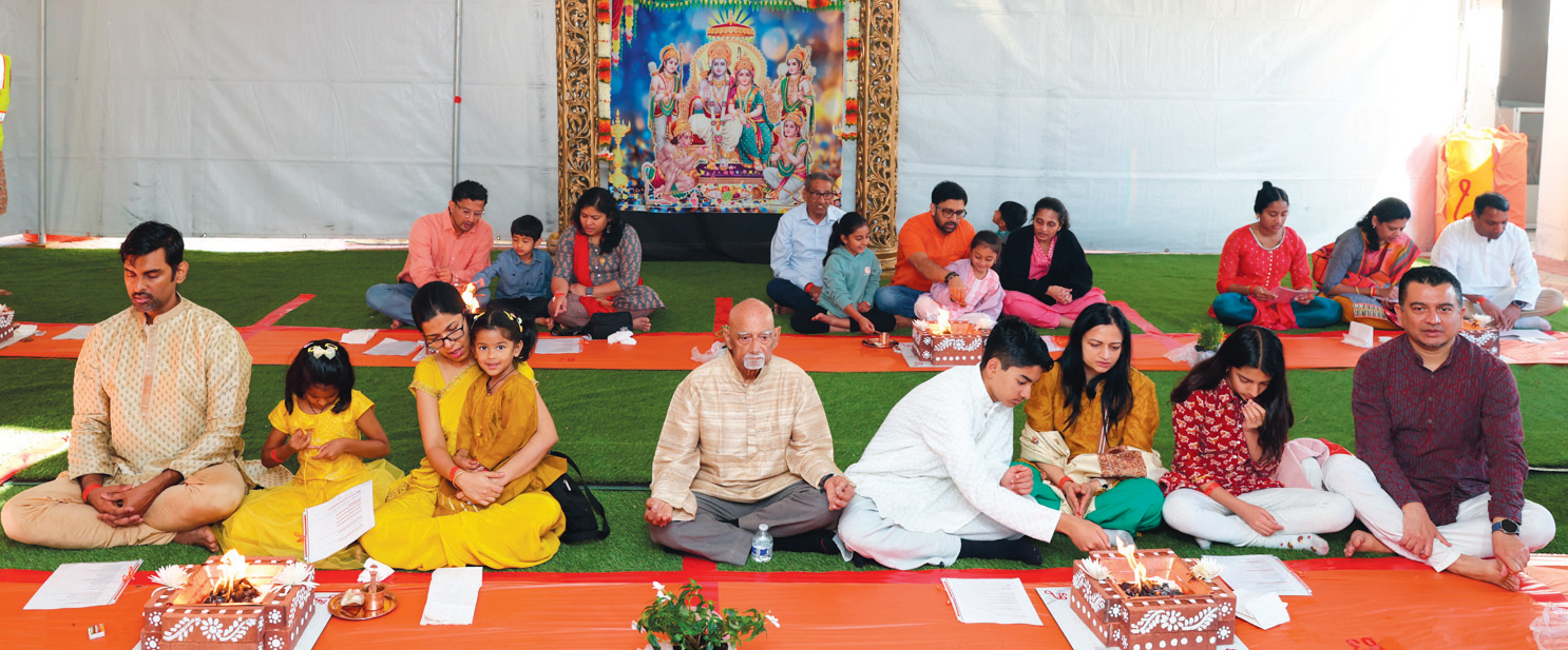 Before March 14 dawned, volunteers arrived to ensure everything was perfectly arranged for the sacred observances. By 6:45 a.m., the sankalpa, the sacred determination, was taken, setting the spiritual tone for the day. Precisely at 7:00 a.m., the opening verses of the Hanuman Chalisa energized the morning and marked the beginning of a day filled with collective devotion. Families moved through the yajna space, sat around the havan kunds, and offered ghee and dried coconut pieces into the shining flames with quiet reverence while the continuous chanting created a powerful and uplifting spiritual atmosphere.