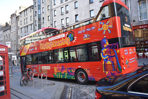 Edinburgh, a city of just over 500,000 people, is not a city of many cars, yet it is well connected by bus and a five-year-old single tram line that runs from the airport to the center and ends at York Place, almost at the base of Calton Hill. There is also the 20-year-old bus service – the 100 Airlink – 24/7 from the airport that has been retrofitted with 6-month old sparkling new double-deckers that have pre-programmed stop messages and even a video monitor showing information in sign language.