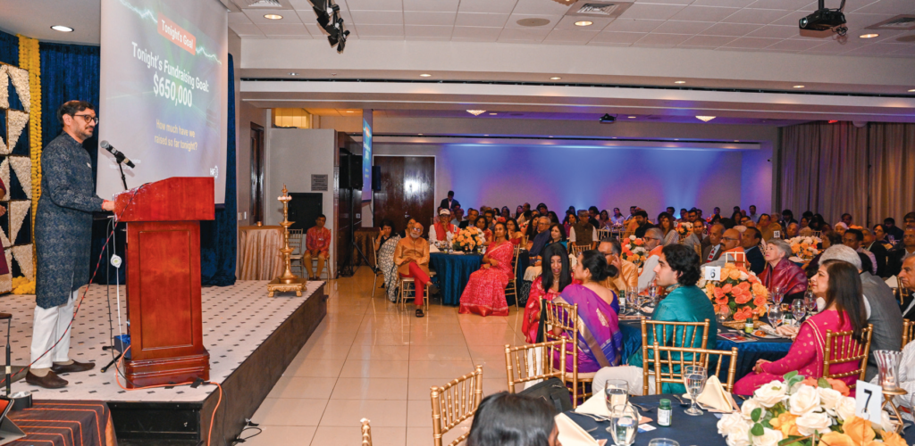 Emcee Priya Pandit took over and presented the audience with a fundraising goal of $650,000 for the evening, noting that they were already over halfway there due to previously made pledges, including a $300,000 pledge from the Bhutada Family Foundation. HAF’s Managing Director Samir Kalra and Associate Director of Philanthropy Amy Parekh interwove HAF’s work with the short film. They highlighted the need for HAF, noting that the Hindu American community only had 10 organizations in the entire country with full-time staff, compared to thousands from other religious groups. This statistic, coupled with the recent finding from the Pew survey that 1 in 5 Hindus raised in America end up no longer identifying as Hindu, caught the audience’s attention.