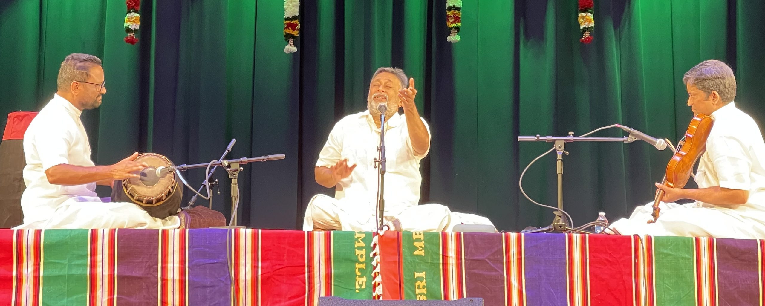 The Classical Arts Society of Houston presented Vidwan Sanjay Subrahmanyan in a vocal concert with Vidwan S. Varadarajan on the violin and Vidwan Neyveli Venkatesh on the mridangam at Sri Meenakshi Temple on Sept 30, 2023.