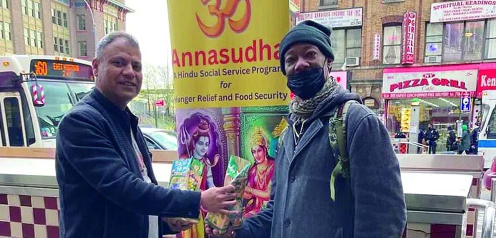 JAMAICA, NEW YORK CITY: On the auspicious occasion of Shankaracharya Jayanti, free food was distributed on the streets of New York City under “Annasudha”, a program for hunger relief and food security in America, established by Shree Mata Darbar, a Maryland based Hindu religious organization. This was a rare occasion when a mainstream Hindu religious organization stepped outside of its own devotee community, and served the needy in the American mainstream.