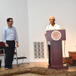 By now India House was beaming with people from all walks of life, in all shapes and sizes, beating the heat to drench themselves in high-octane spiritual experience, in anticipation of the chariot-pulling. The procession of deities or the pahandi started with the eldest in the family, Shri Balabhadra, which was followed by Devi Subhadra and finally Shri Jagannatha. The pahandi of each deity was associated with high-energy ecstatic dance and music, which reached its crescendo when Shri Jagannatha or known fondly as ‘Kalia’ made way to the Chariot. Before the Chariot could roll the ceremonial sweeping or the Chhera Pahanra, where traditionally the King of Odisha or the Gajapati sweeps the Chariots was emulated by anointing a prominent member of the community. The Chariot powered by devotion made a big parikrama around the India House and made its way back to be greeted by representatives from various religious and spiritual organizations of Greater Houston area. As the sun was setting with the sanguine hue in the sky, the ‘Samuhika Maha Aarti’ was performed which was followed by personal darshan, thus bringing close to yet another eventful and fulfilling Rath Yatra.