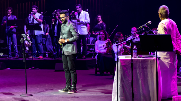 The audience was wowed by the magnanimous size of his team that included over 85 musicians, of which a 60-member symphony orchestra had teamed up from Budapest, Hungary, with conductor Laslov Kovach and super talented Indian classical musicians from India. His composition is always a treat to experience and so was this grand event. He was accompanied by singers K.S. Chitra, Mano, Haricharan, Rahul Nambiar, Sharath and Santosh. Each one of the singers touched his feet to seek his blessings before they began singing.