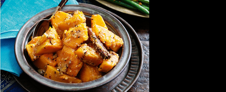 Although the biggest use of petha (pumpkin) in India is to make the white, crystallized delicacy made famous in Agra, in North India we also make not only the sweet petha da halwa but a regular, salted, spicy dish that all love to eat with roti and paranthas. In the US, during the Halloween season when pumpkins are so widely available, it is a good opportunity to make a dish other than the traditional pumpkin pie.