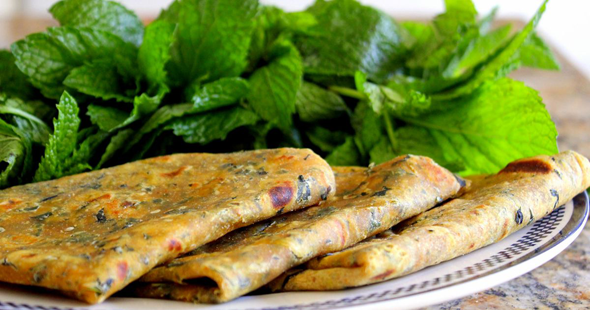 These days there are many varieties of ready-made paranthas available in the frozen foods section of grocery stores made by many well-known brands which have seen the huge market potential. Though these are wonderful conveniences, with a few exceptions (the more expensive cauliflower or mixed vegetable ones), the frozen variety use the stuffing – like ajwain (carom seed) or methi (fenugreek) – so sparingly that you may only get a slight hint of the taste, if at all! An ingredient that is seldom used in Punjabi paranthas (but available in the frozen variety) is pudina (mint), which is most often used to make the popular mint chutney (spicy dipping sauce), a condiment for dipping savory appetizers like pakoras fried vegetable fritters), samosas (fried stuffed dumplings), tikkas (pan roasted potato patties) and other spicy snacks.
