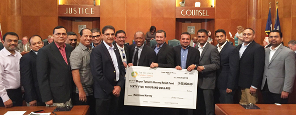 HOUSTON: SIMA and Surti Leuva Patidar Samaj (SLPS) of Dallas Fort Worth members presented Mayor Turner and City Council Members a check of $65,000 for Hurricane Harvey Relief Fund.