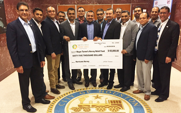 On February 27, Hasu Patel, President of the Small Independent Motel Association (SIMA) of Houston and SIMA Board of Directors, along with several local Indian-American community organizations, welcomed Jack Patel, President of the Surti Leuva Patidar Samaj of Dallas Fort Worth, and their delegation who raised $65,000, from their membership of more than 900 families, to donate to City of Houston Mayor Sylvester Turner’s Hurricane Harvey Relief Fund.