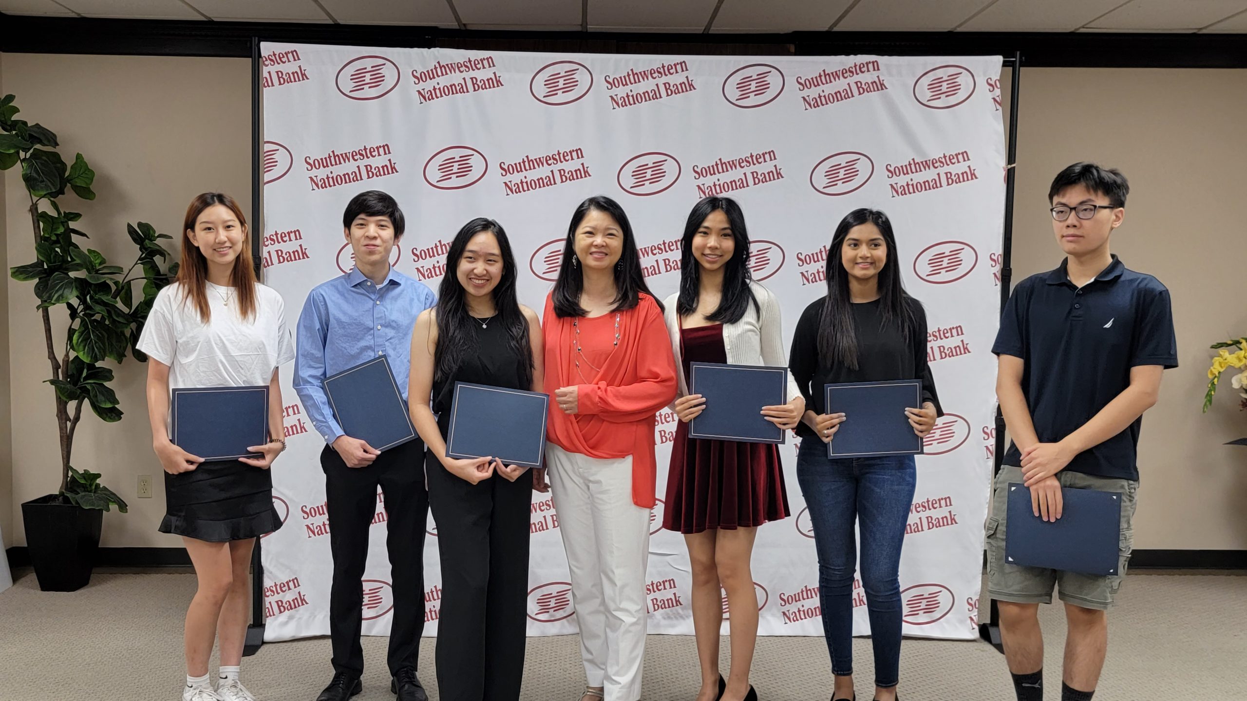 An award ceremony was held at the headquarters of Southwestern National Bank on 6/24/2022. Chairwoman Jody Lee was present along with the family and friends of the scholarship recipients. (Member FDIC)