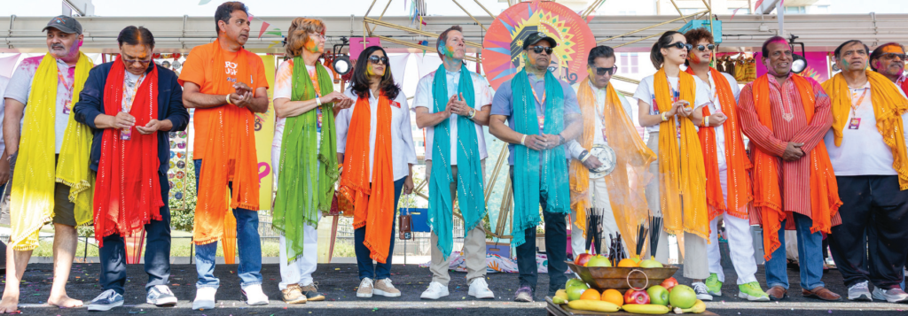 Still under the Khumb Mela Influence, Masala Radio’s Evening Rush Hour Radio Jockey Sunil T choregraphed a soulful Holi Pooja under the blessing shloka recitals of Shiv Shakti’s Hardik Maharaj, and Vadtal Dham’s Madan Mohan Maharaj. He introduced the community elected officials, including Texas State Board Rep Julie Pickerin, Fort Bend County Judge KP George, Sugar Land Mayor Carol McCutheon as well as 80 sponsors led by Houston Holi Title Sponsors Ramji Law Group’s Arshad Ramji and Know Your Lingo’s Parvez Jasani & Brijesh Chaudhuri, with over a dozen political candidates representing our future leaders.
