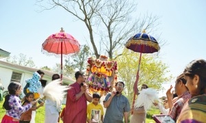 PEARLAND: On a warm and beautiful wintery morning more than 500 devotees gathered and eagerly weaved their way in a winding queue to enter through a special door for the darshan of Lord Narayana, resplendent on the Garuda Vahana (mythical bird that is the mount of the Lord) with Sridevi (Mahalakshmi) and Bhoodevi (Mother Earth). Chants of “Govinda! Govindaa!!” rose amidst the singing of bhajans by enthusiastic devotees. The place was Houston’s own Sri Meenakshi Temple in Pearland, and the occasion was the Vaikunda Ekadasi celebration on Saturday, January 11. The belief among devotees is that, Vaikunda Dwaram (or the gate to Lord’s Inner Sanctum) is opened on this day. This was symbolically represented at the temple by devotees entering the main temple through a special door which signified walking into Swarga Vaasal (the door to heaven). After taking darshan the devotees took a procession of the magnificently seated divine Lord Narayana with the divine mothers around the temple.