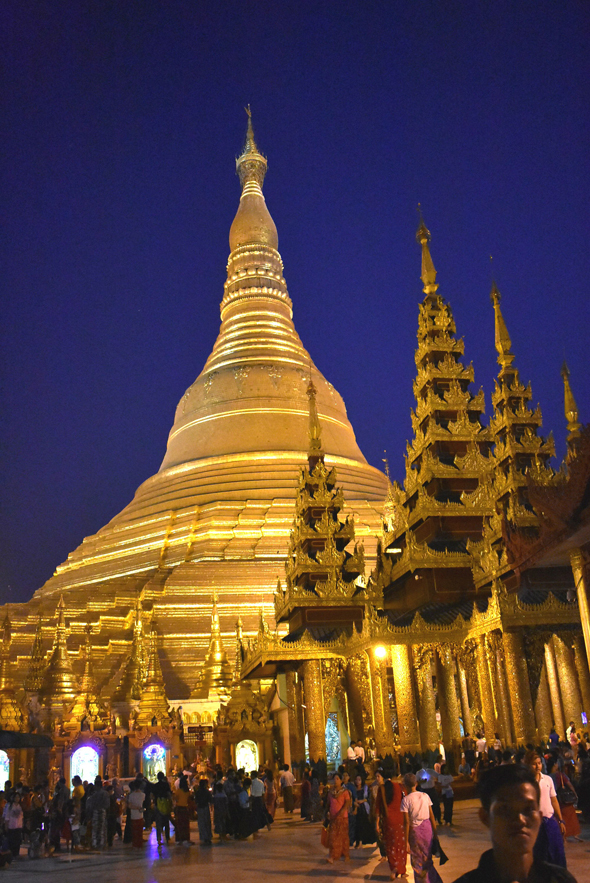 The gilded Shwedagon Pagoda is lit up at night and can be seen from anywhere in the city